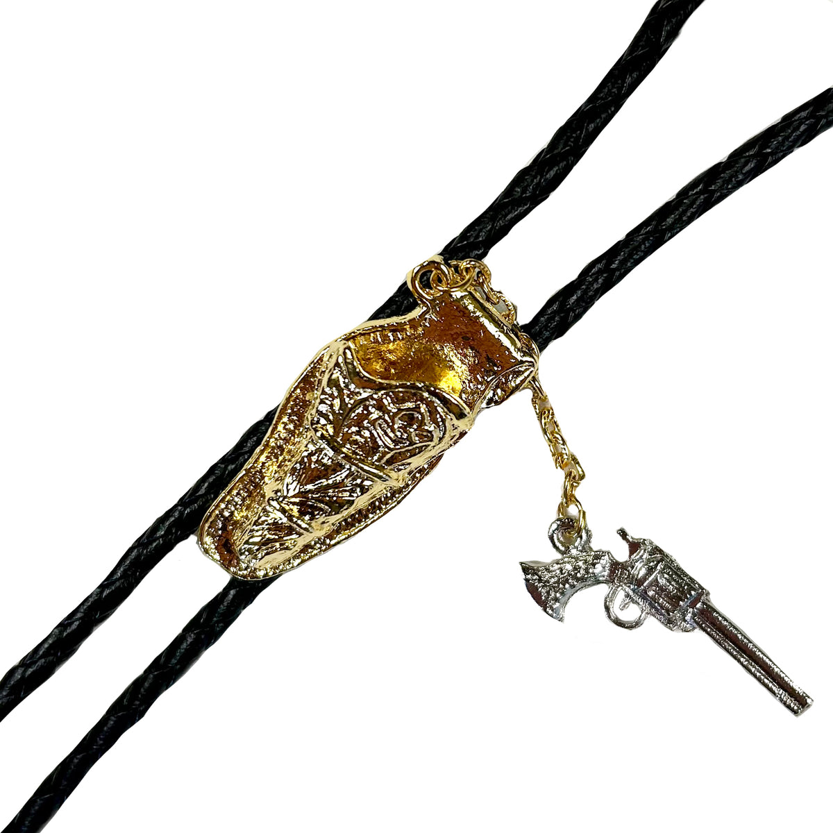 Unique and artistic Silver Six Shooter bolo tie made to complete the Western look. Rockmount Ranch Wear's founder Papa Jack was the first to commercialize bolo ties.