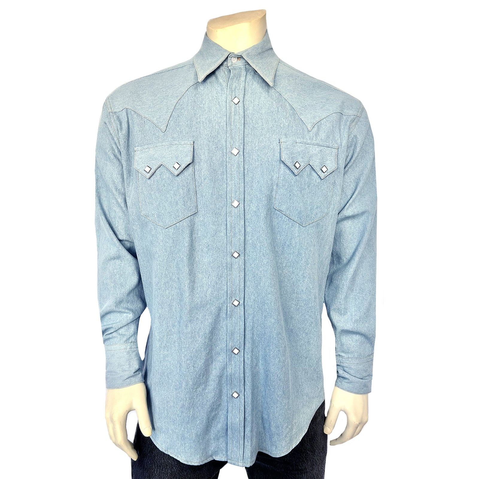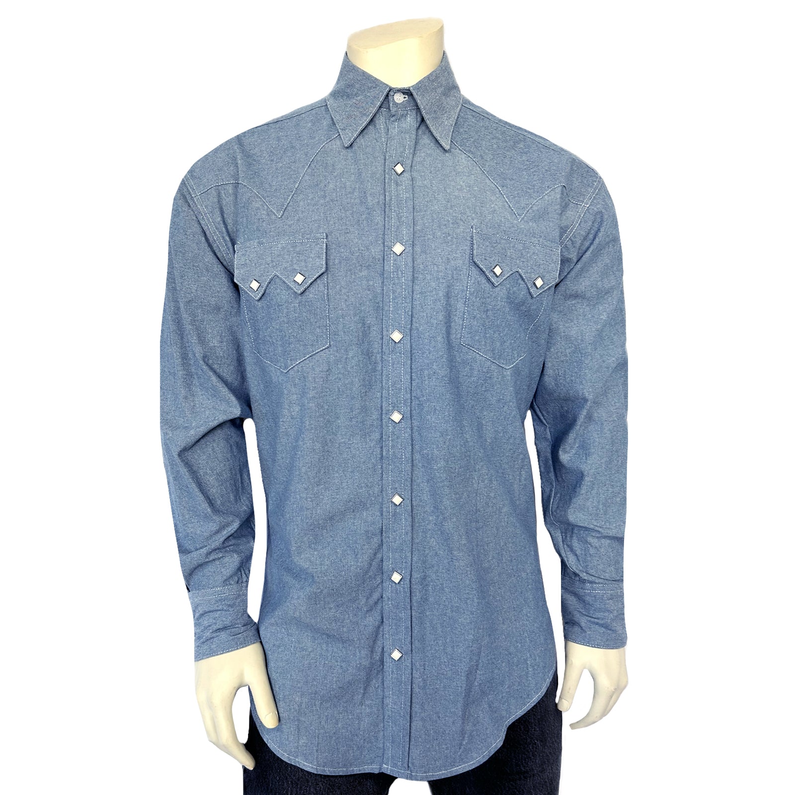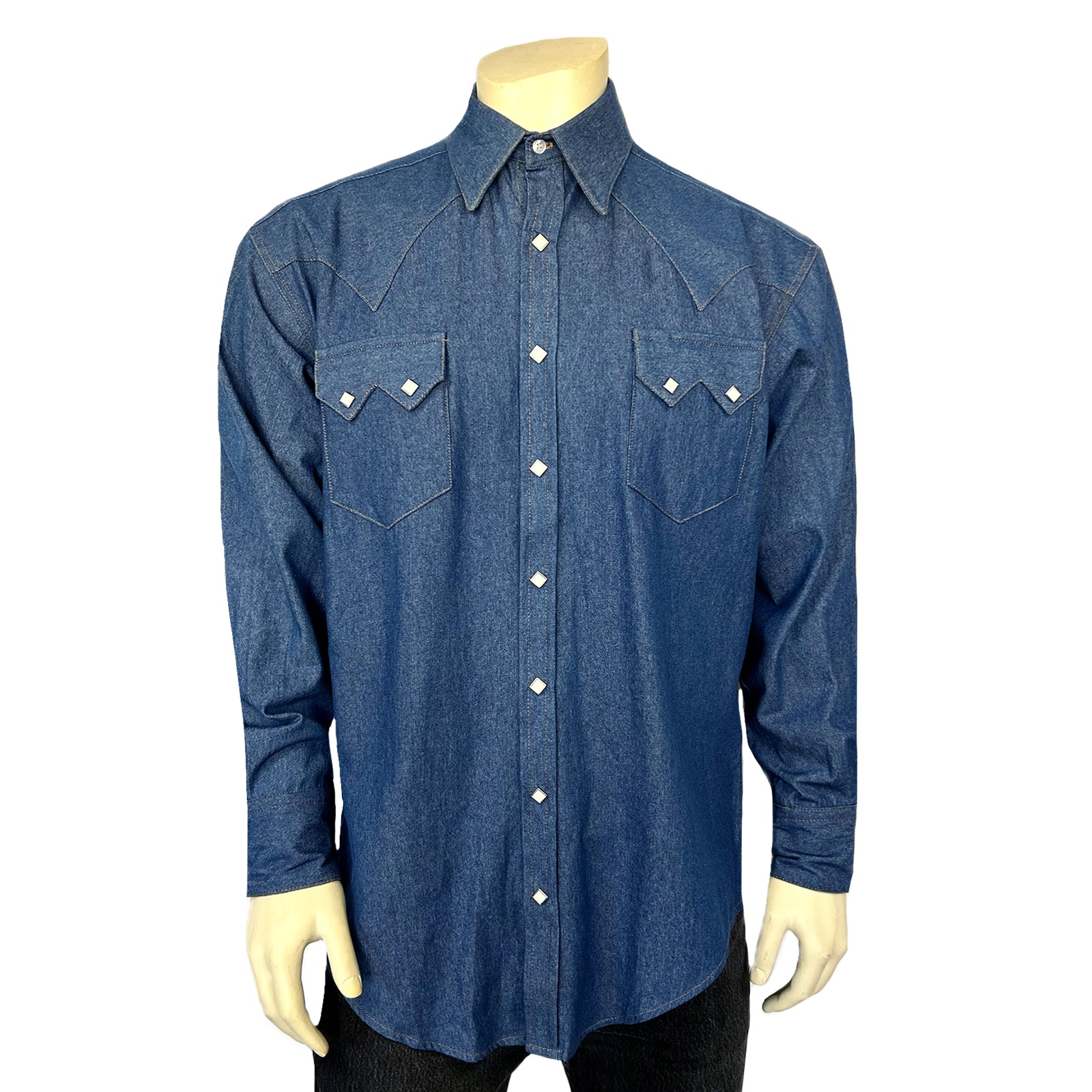 We believe this is a one-of-a kind in the market. This is the longest running shirt design in America, our signature classic. The soft laundered denim is 7 oz. yarn dyed with rugged double needle construction. This shirt is made to last. Design features include classic Rockmount Sawtooth pockets and Diamond snaps. Relaxed fit. Made in USA.