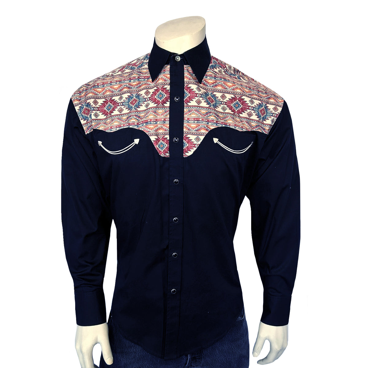 Men's Vintage 2-Tone Black & Native Pattern Embroidered Western Shirt