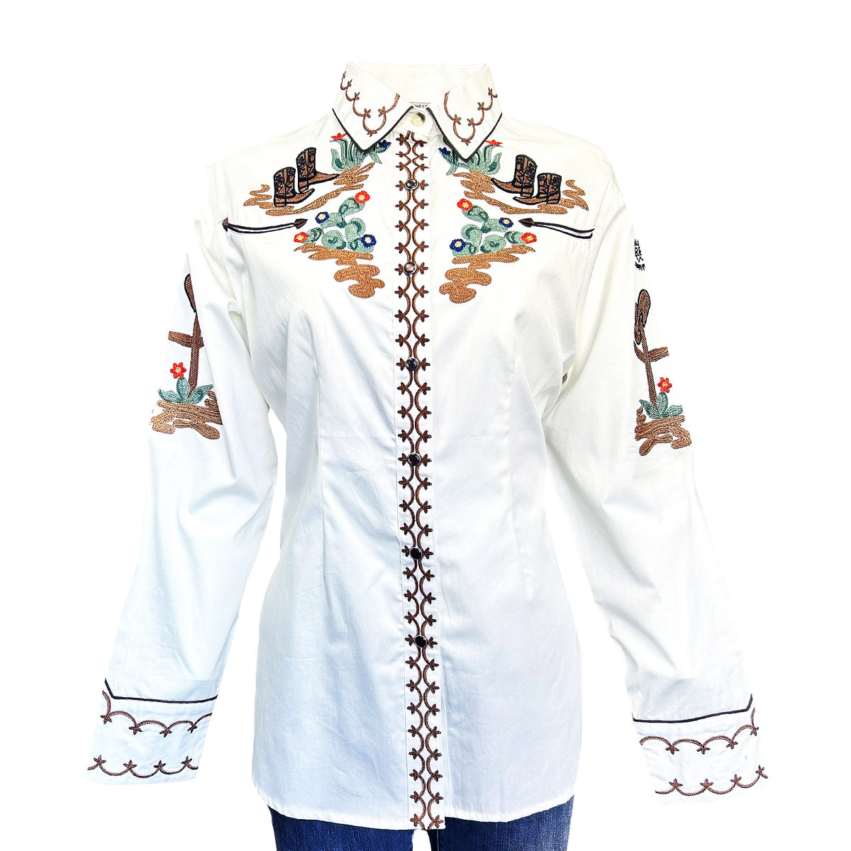 Kid's Ivory Cactus & Cowboy Boots Embroidered Western Shirt
