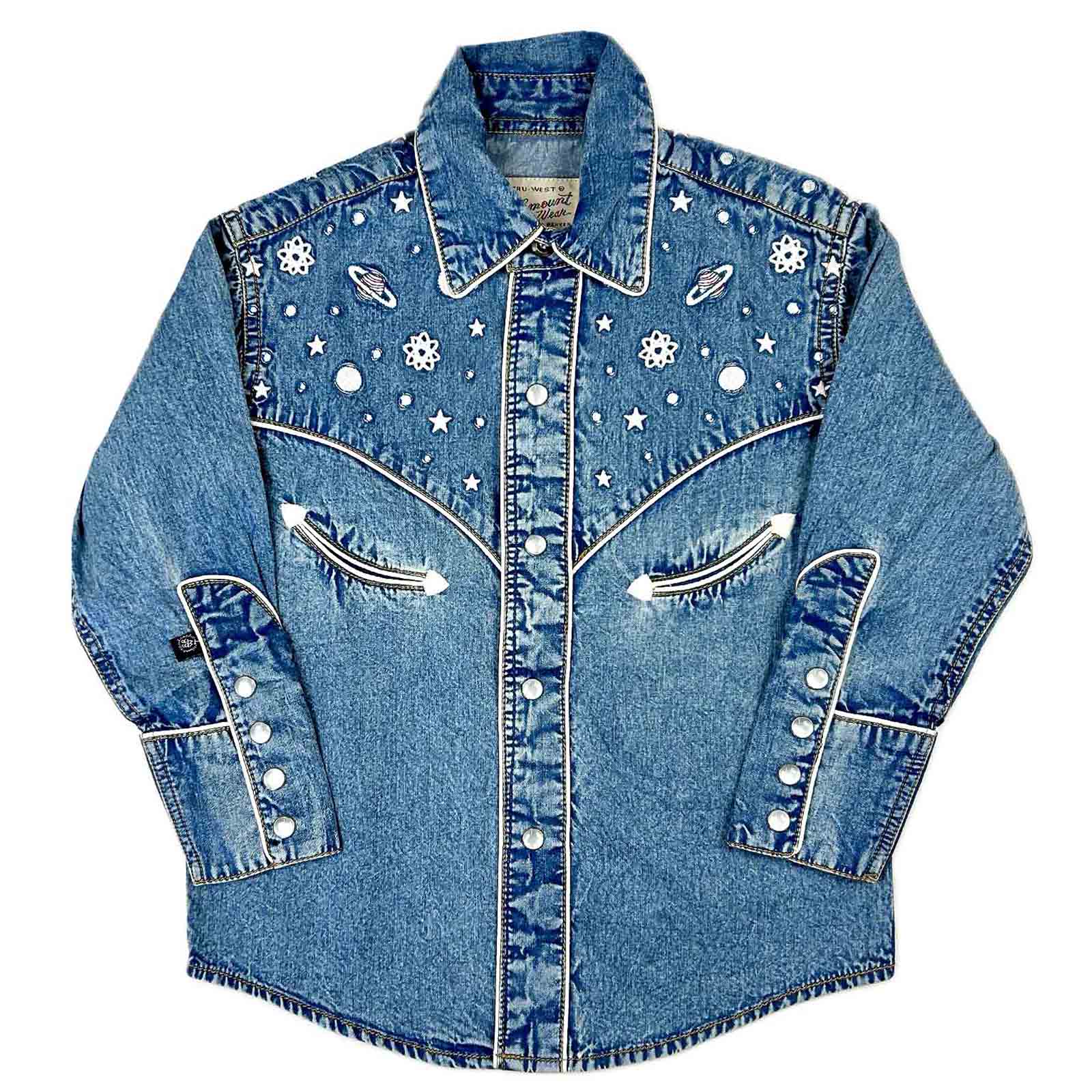 This Rockmount shirt is out of this world! Jean Luc Picard goes to Wyoming. Western is all about the details and this has it all: embroidery throughout front, back & cuffs, Smile pockets with embroidered arrows (not those cheap sew-on tabs), piping on yokes, collar, front and Shotgun cuffs. Fabric is 100% cotton Gabardine twill. Relaxed fit. Imported.