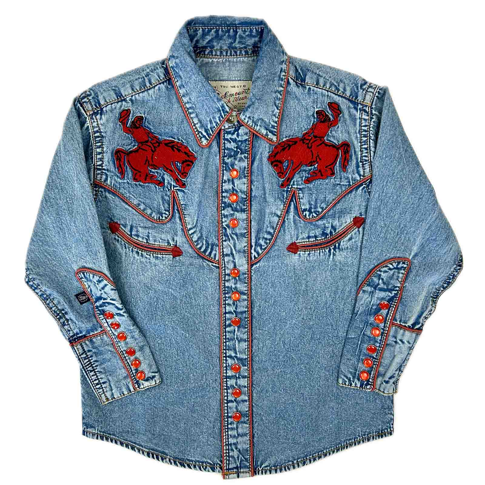 Nothing says the West like the iconic image of the bronc. These embroidered Kid's western shirts have highly stylized yokes with piping, special snap pattern on front and shotgun cuffs, and Smile pockets with arrow embroidery. Kid's are relaxed fit. Imported.