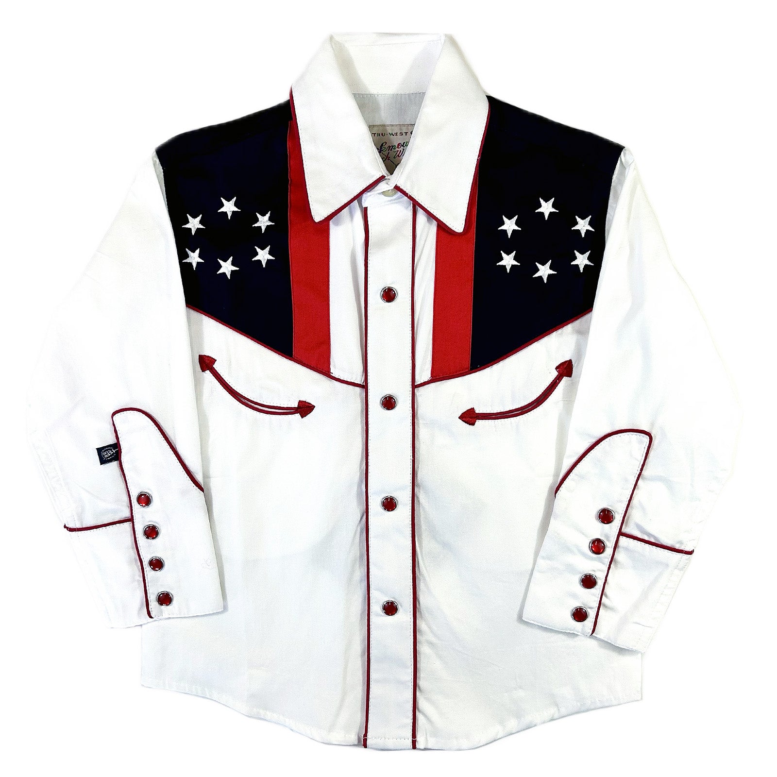 Our USA flag inspired kid's shirt is finely made with embroidered stars and stripes applique. Its special treatments include Smile pockets with embroidered arrows, Shotgun cuffs and matching snaps and piping. Fine year-round weight 100% cotton gabardine twill. Imported.