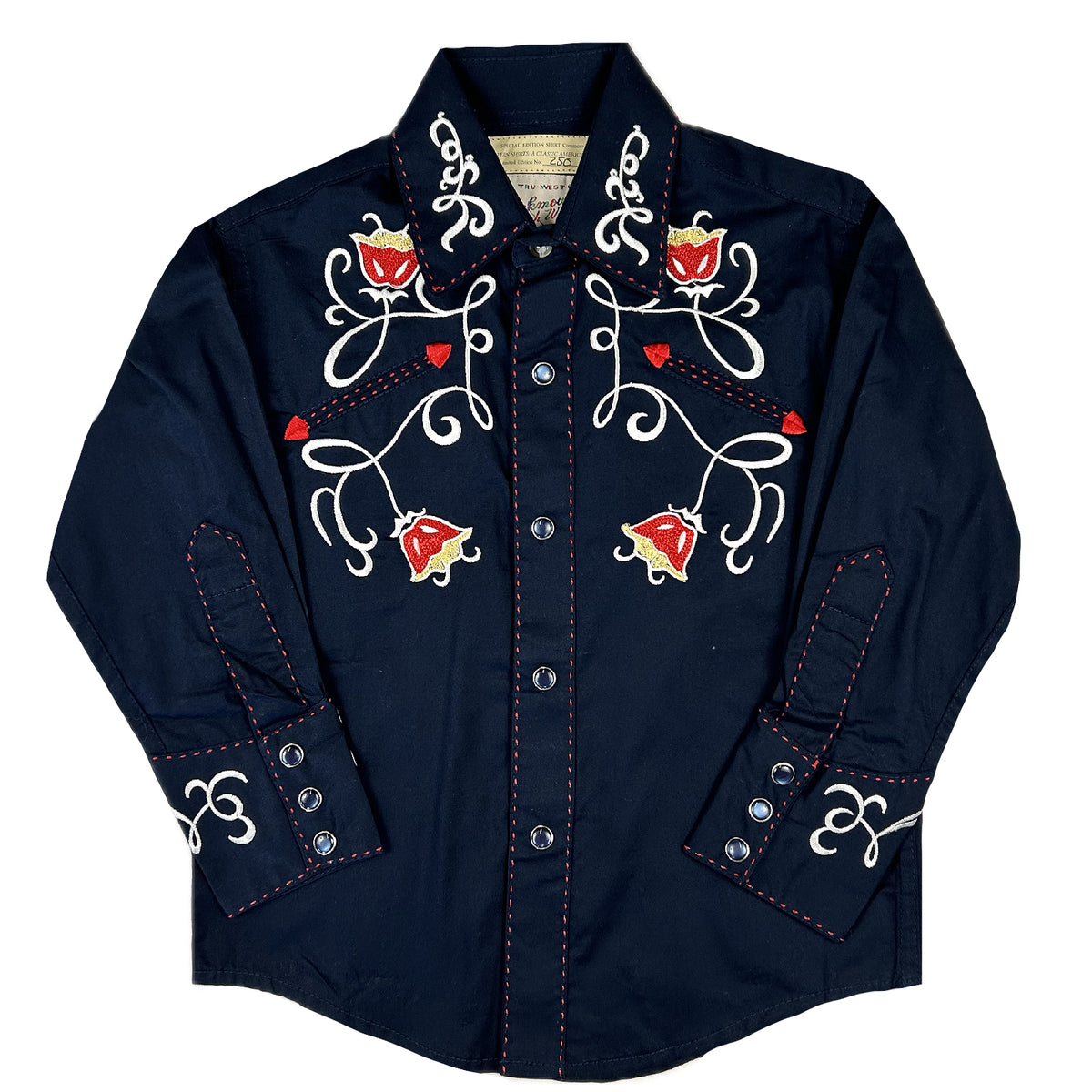 One of the great things about our business is that from time to time we find an unknown design we made 50 years ago. When I first saw this design my grandfather and father made in the '50s, it stopped my breath. It is so rare we have not seen one since it was originally made. A collector from Detroit had it and knew that I archive our vintage shirts. It's nice to meet others who appreciate the importance of preserving Western history. Everything about this design works beautifully. The ornate flower embroidery coordinates well with red saddle stitching. Heavily embellished on collar front and back, with special single point cuffs, our remake for men, women and children is a perfect replica of the original. Fabric is 100% cotton. Imported.