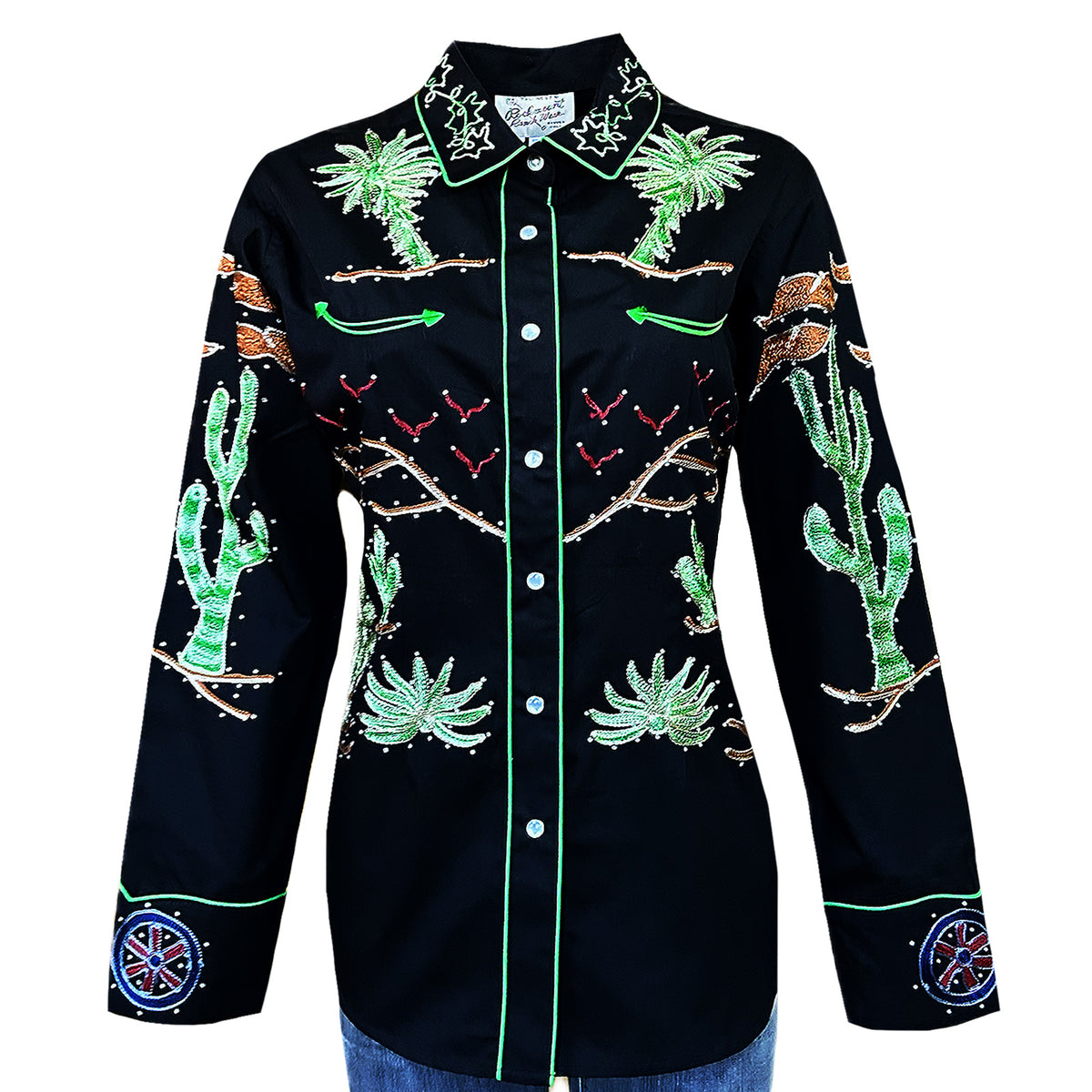 The Autry Museum asked us to remake this classic Porter Wagoner black western shirt. A work of art, this design has it all: exquisite hand chenille embroidery and rhinestones just like the '40s original. Embroidery throughout: covered wagon, palm trees and cacti. Fabric is 100% cotton gabardine twill. Imported.