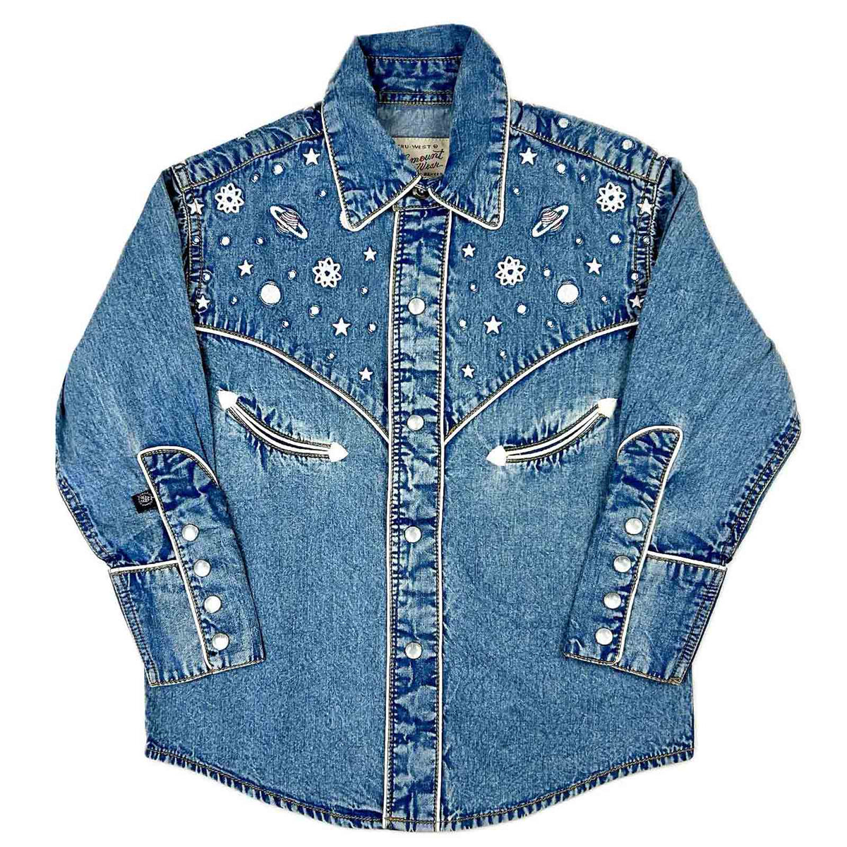 This Rockmount shirt is out of this world! Jean Luc Picard goes to Wyoming. Western is all about the details and this has it all: embroidery throughout front, back & cuffs, Smile pockets with embroidered arrows (not those cheap sew-on tabs), piping on yokes, collar, front and Shotgun cuffs. Relaxed fit. Imported.