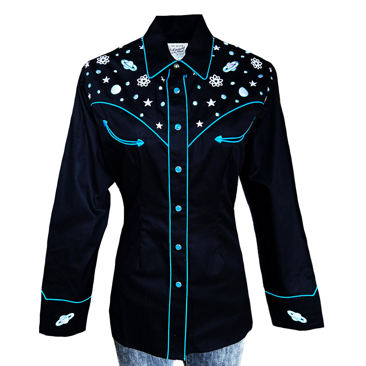 This Rockmount shirt is out of this world! Jean Luc Picard goes to Wyoming. Western is all about the details and this has it all: embroidery throughout front, back & cuffs, Smile pockets with embroidered arrows (not those cheap sew-on tabs), piping on yokes, collar, front and Shotgun cuffs. Fabric is 100% cotton Gabardine twill. Relaxed fit. Imported.