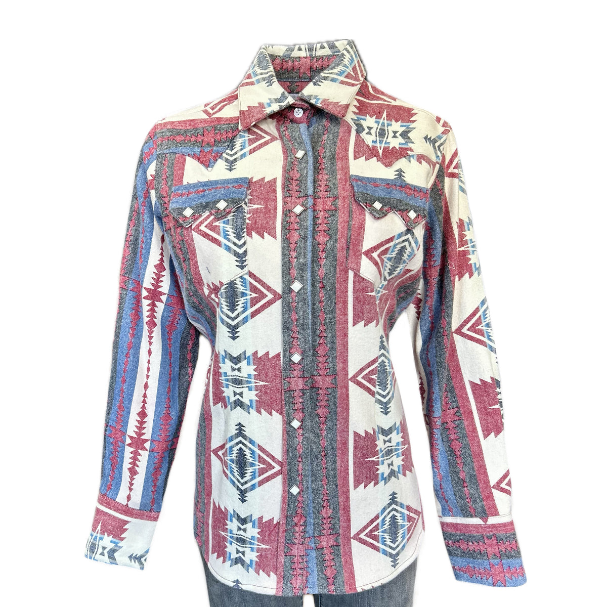 This flannel is a state-of-the-art woven jacquard Native American design, a beautiful collaboration of color, pattern, and our signature make. The fabric is our popular heavy construction chenille flannel with yarn dye pattern in 100% cotton. The design is our signature Sawtooth pocket & Diamond snap model, the longest running shirt in America. Fit is comfortable and relaxed. Made in USA.