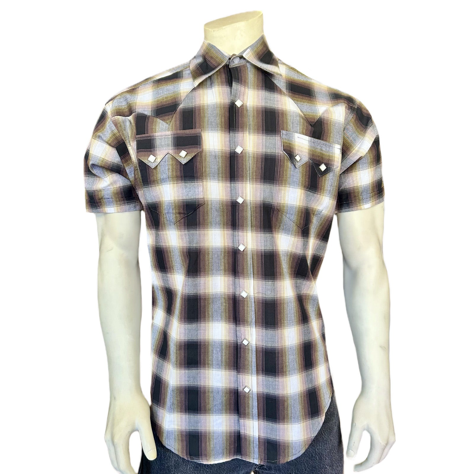 Elvis wore Rockmount plaids, and we love a good plaid same as he did. These are our custom shadow plaids based on popular patterns from our archives. Fresh patterns say summer, and are cool for hot weather in 100% cotton yarn dyed fabric. It features 1" short sleeve cuff, rugged double needle construction, and our classic Sawtooth pocket & Diamond snap design. Relaxed fit. Made in USA.