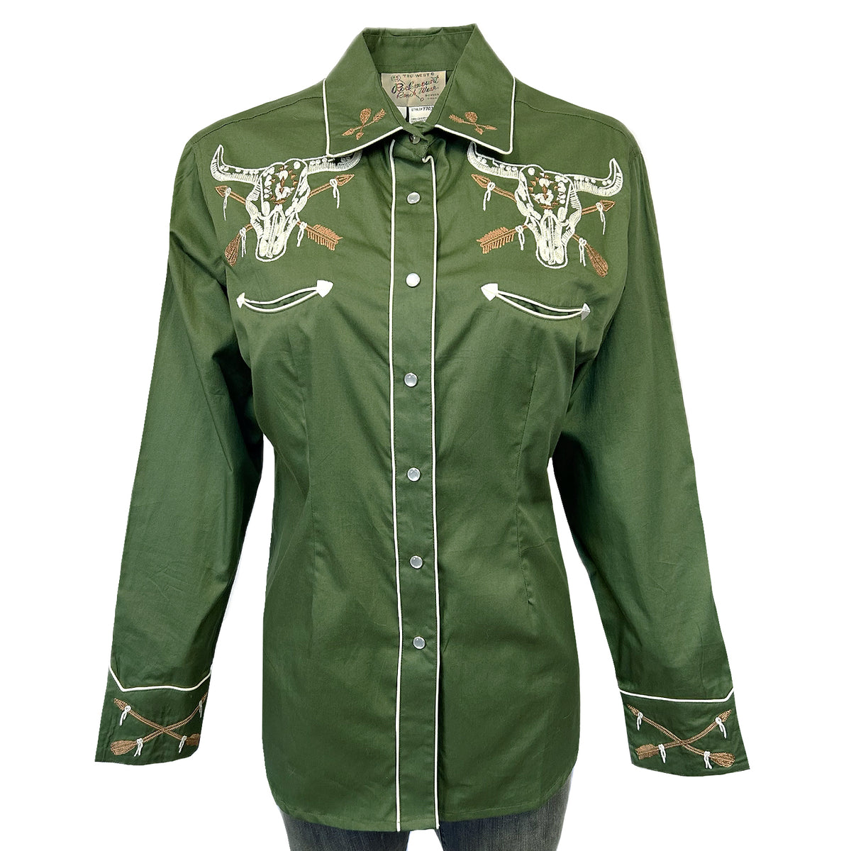 Men’s Vintage Green Steer Skull & Arrow Chain Stitch Embroidered Western Shirt