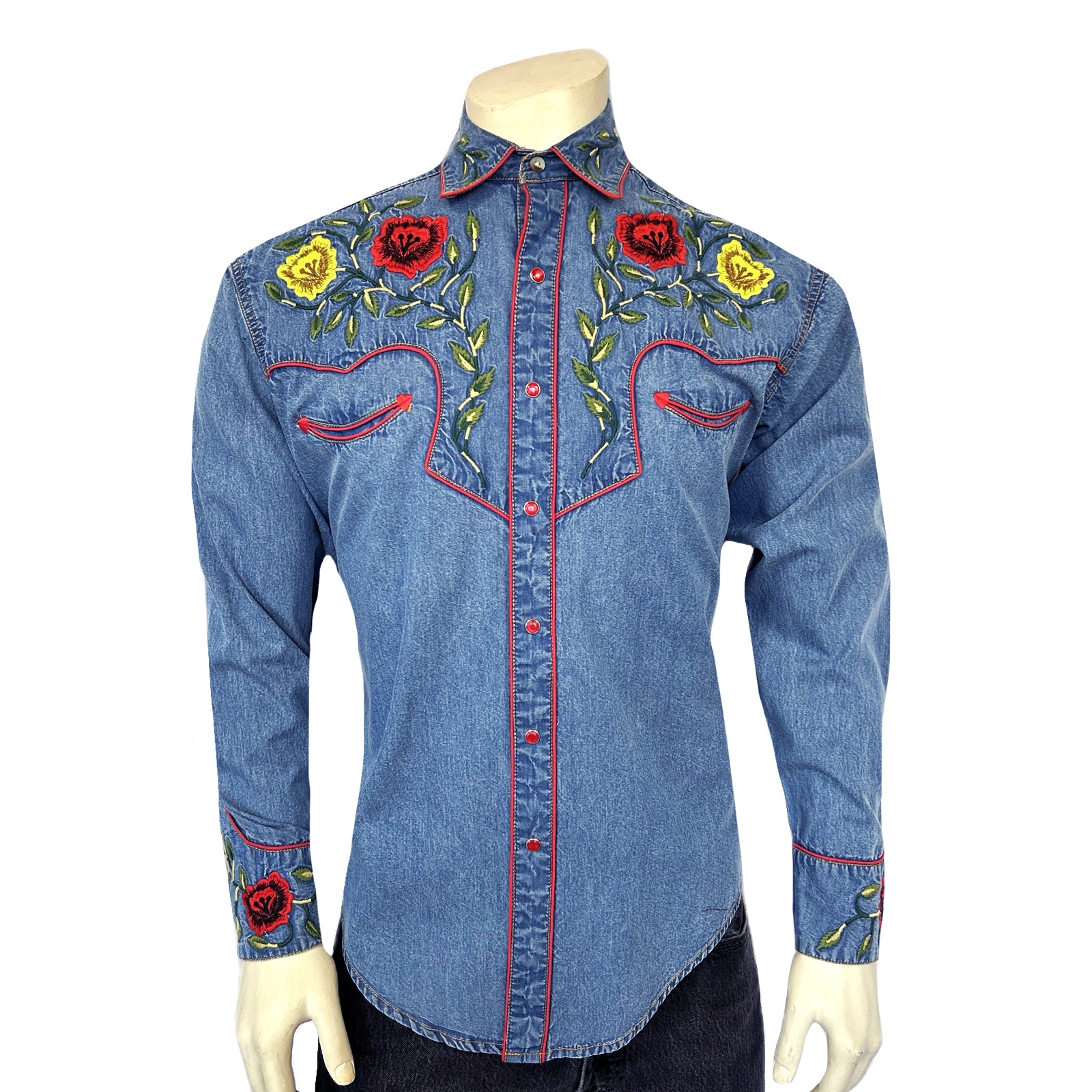 We have been doing embroidery for four generations and this represents the art at its highest form. This 2-tone embroidered shirt features scalloped yokes, accent piping, Smile pockets with embroidered arrows, piping, Shotgun cuffs, and exquisite floral embroidery with detail and color gradation. Imported.