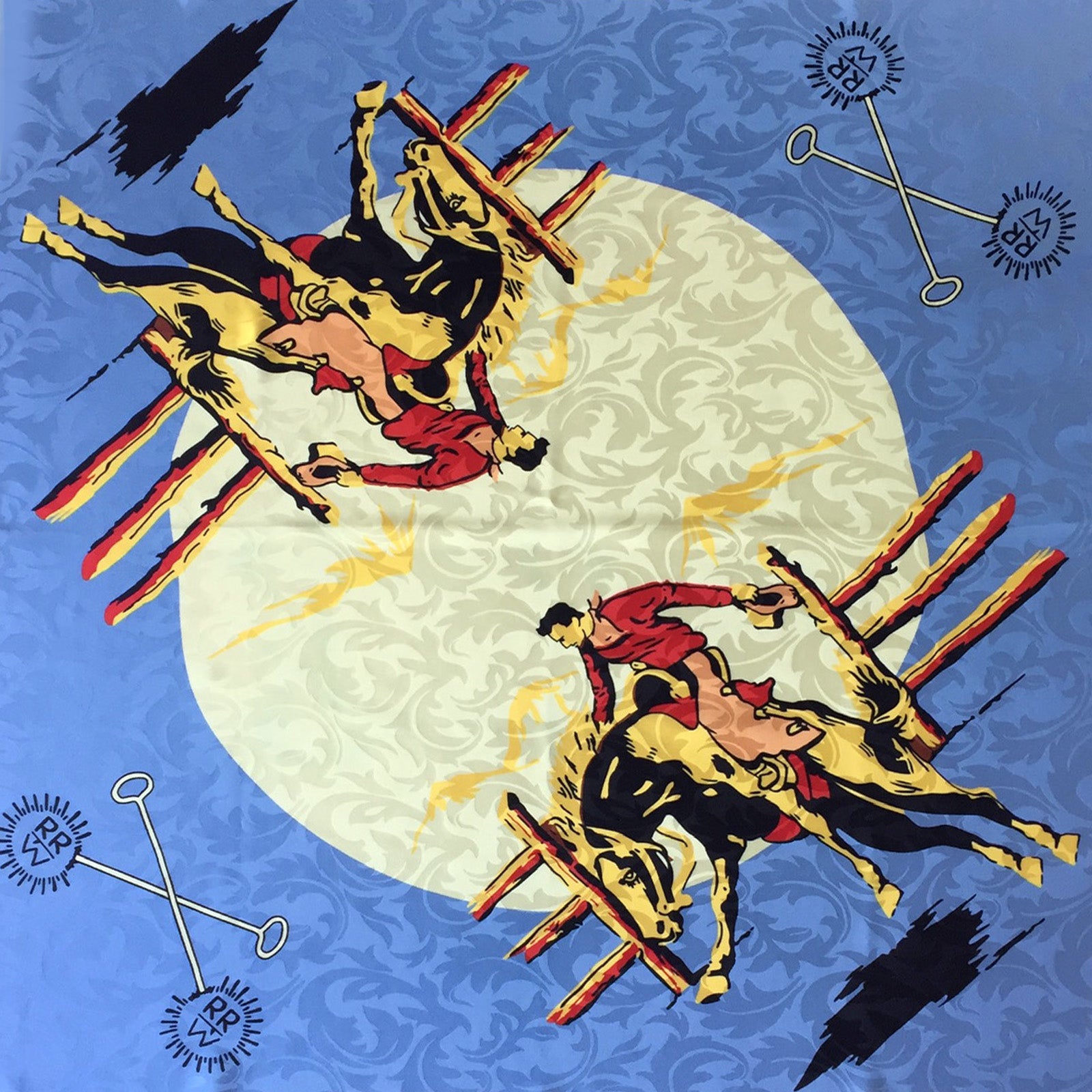 100% silk western Jacquard, 36" square, hand-stitch rolled hem, unisex. Our signature vintage bronc logo, first introduced in 1946.