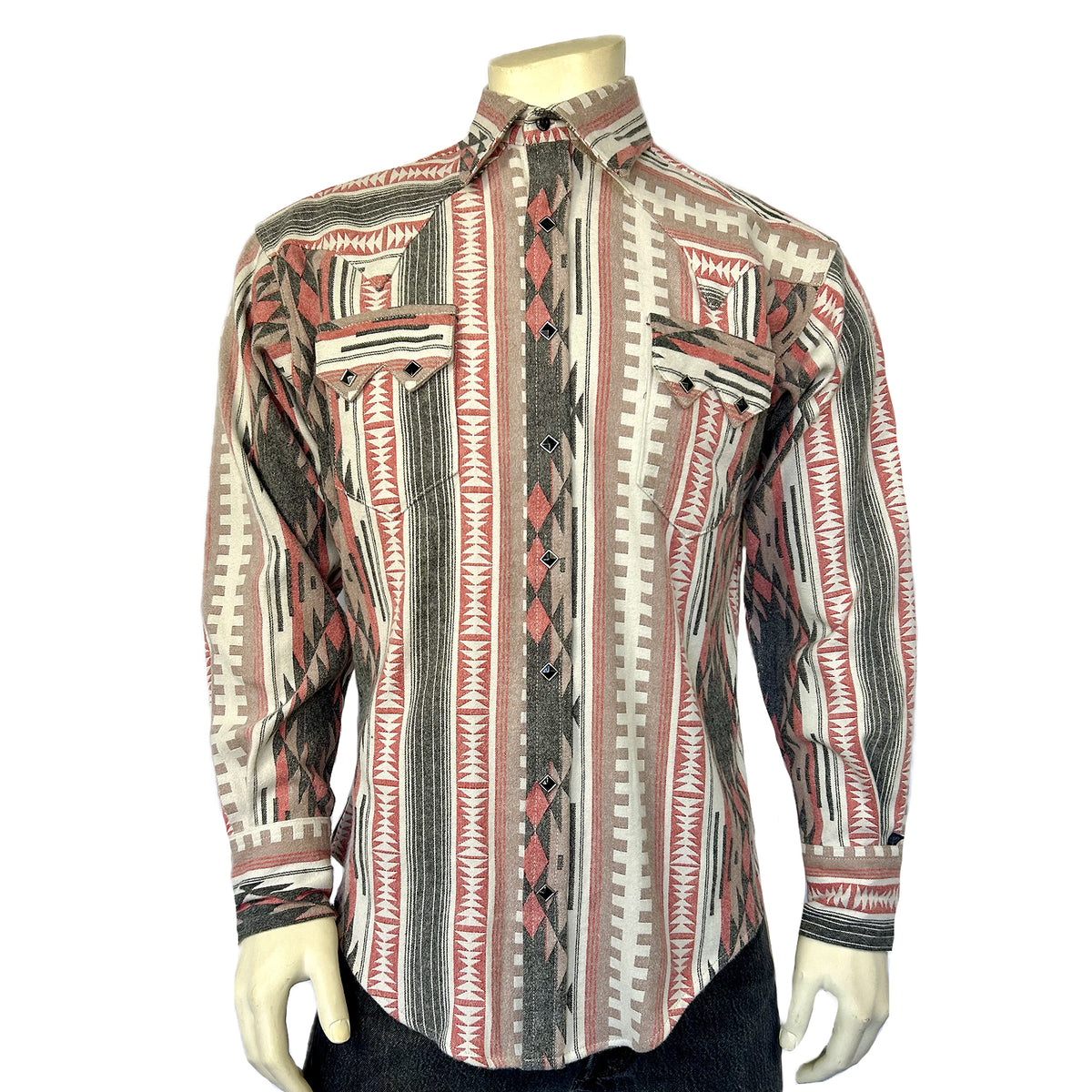 This flannel is a state-of-the-art woven flannel Native American design, a beautiful collaboration of color, pattern and our signature make. The fabric is our popular heavy construction chenille flannel with yarn dye pattern in 100% cotton. The design is our signature Sawtooth pocket & Diamond snap model, the longest running shirt in America. Fit is tapered with darts.