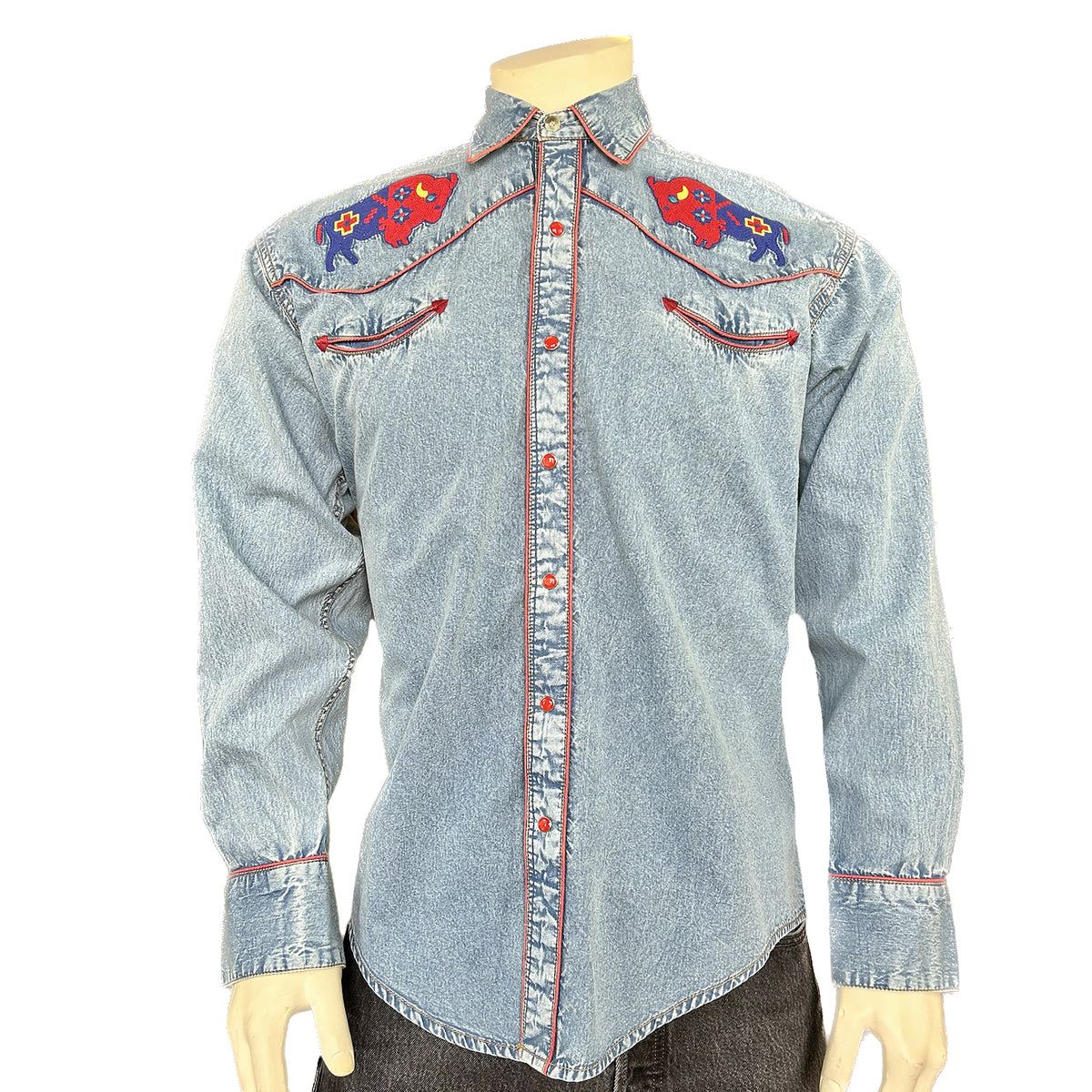 What is more iconic than the American Buffalo? In tribute, we created very special artisan embroidery reflecting the art of fine Western craftsmanship. The chenille embroidery on front and back stands far above what is common in the market. The ornate back design features Native American iconography including bison, mountains and arrows. Other features include arrow head embroidered Smile pockets, Shotgun cuffs and of course snaps that match the piping. Fabric is soft and natural 100% cotton blue chambray in year-round weight. Imported.