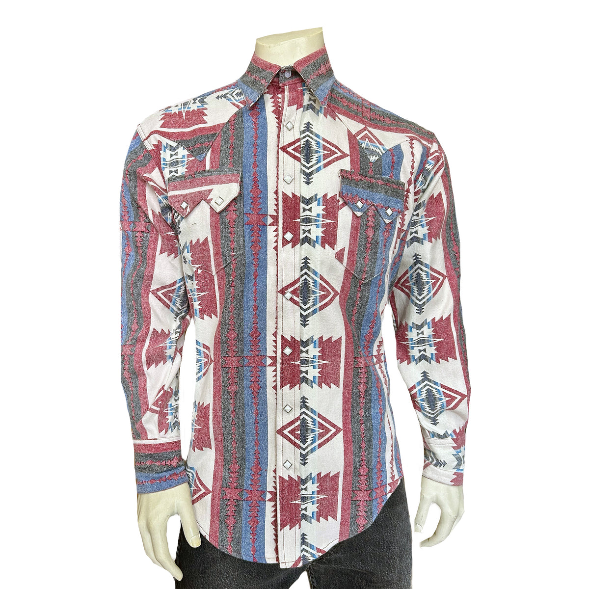 This flannel is a state-of-the-art woven jacquard Native American design, a beautiful collaboration of color, pattern, and our signature make. The fabric is our popular heavy construction chenille flannel with yarn dye pattern in 100% cotton. The design is our signature Sawtooth pocket & Diamond snap model, the longest running shirt in America. Fit is tapered with darts. Made in USA.