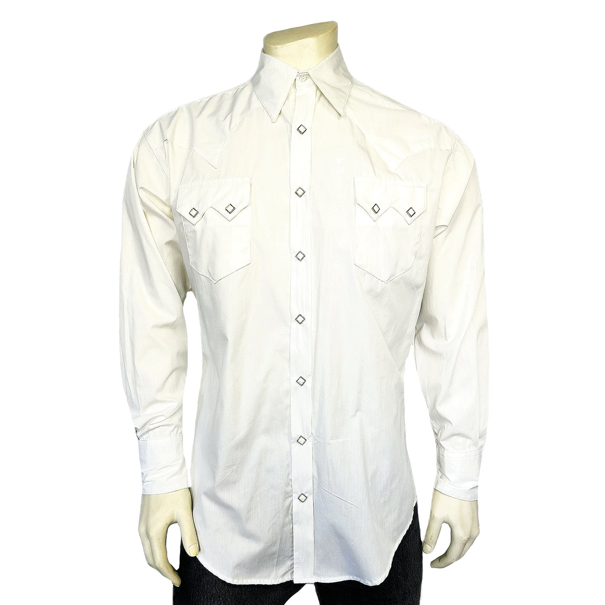 Feel the wonderful hand of the finest Pima cotton poplin. Photos do no justice. This white western shirt has the substantial hand reminiscent of the fine all cotton sheets we used to have. Features signature Rockmount Diamond snaps and Sawtooth pockets, and tapered fit with darts. Made in USA.