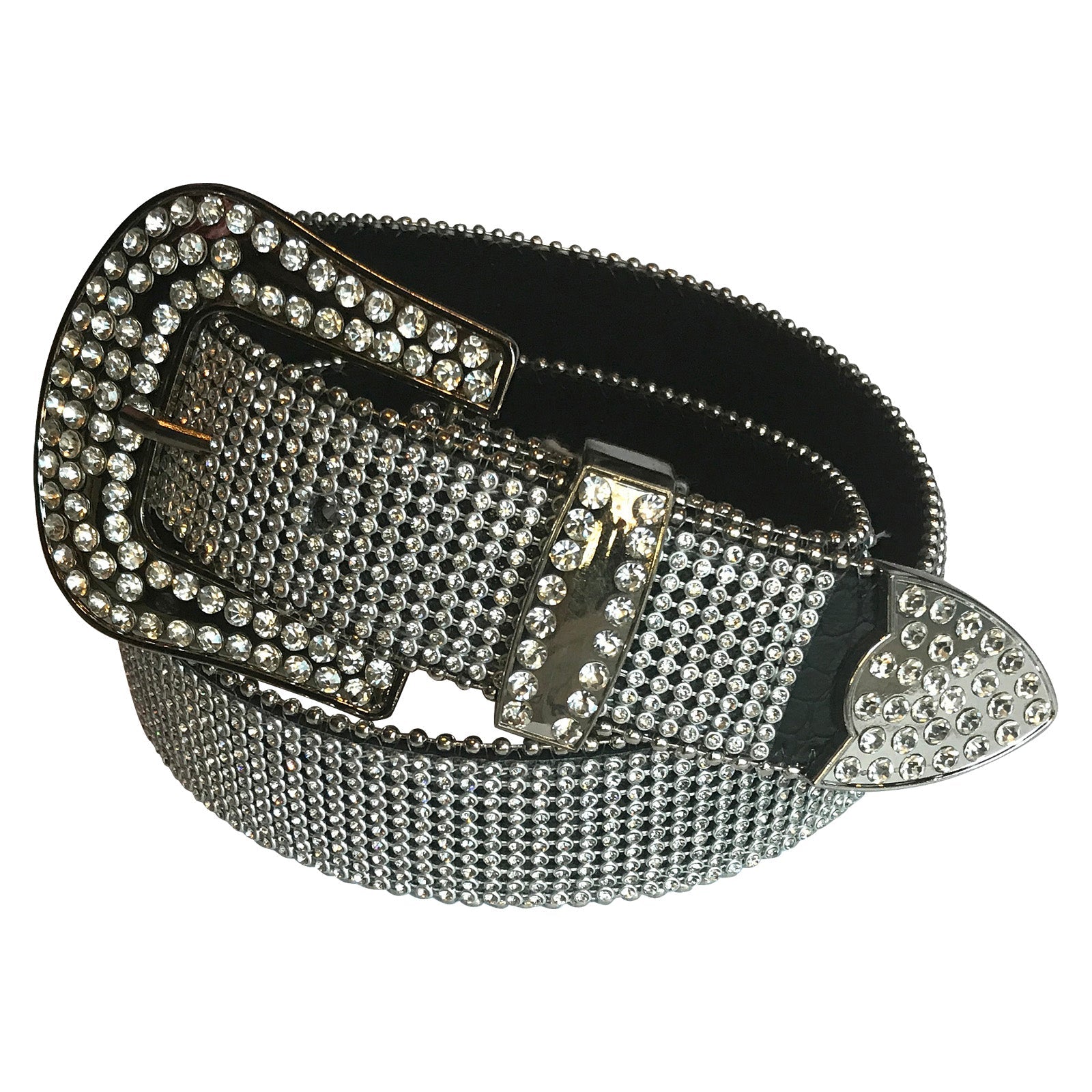 Fine tooled ostrich pattern saddle leather with full coverage pave rhinestones which looks like a million bucks! 1-1/2" wide belt has rhinestone studded 3 piece buckle set, and strap has fully beaded edge. Snaps make it easy to change buckle.