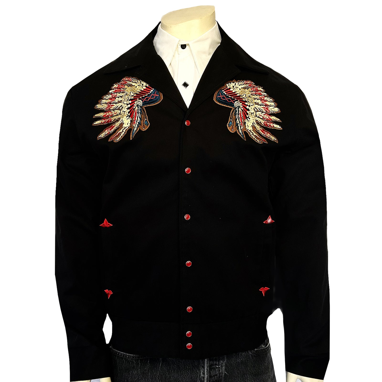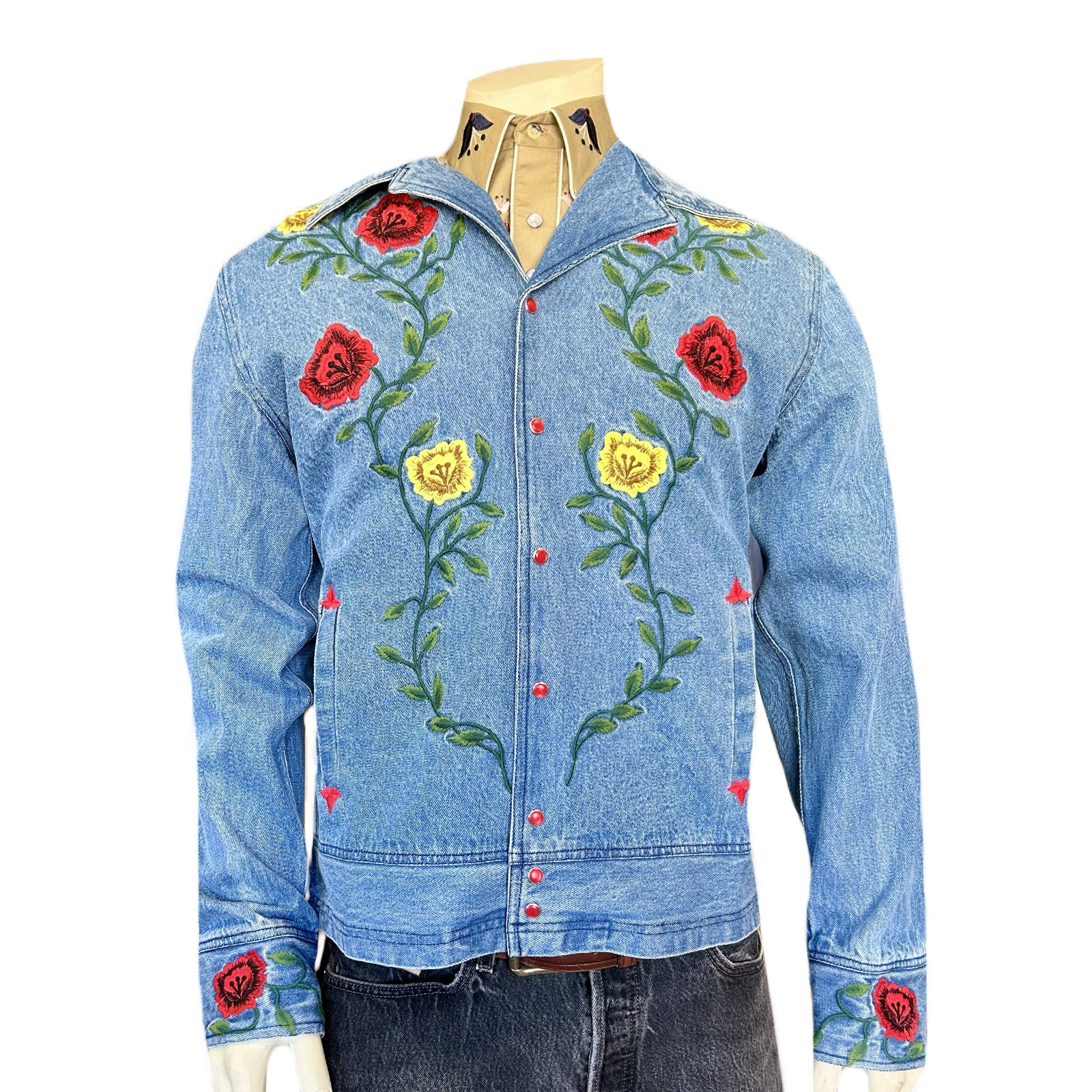 Our famous bolero jacket have been extremely popular, a hit with rock stars which is why we added denim for a fresh new twist. Made just like the 50s original, stonewashed 100% Cotton Indigo denim, a year a round weight. Beautifully chain stitch embroidered on front, back and sleeves, stylized snap treatment on front and pockets with embroidered arrowheads. This is not mass produced, they take time to make by hand. Note fit runs smaller than shirts, so size up for men. Imported.