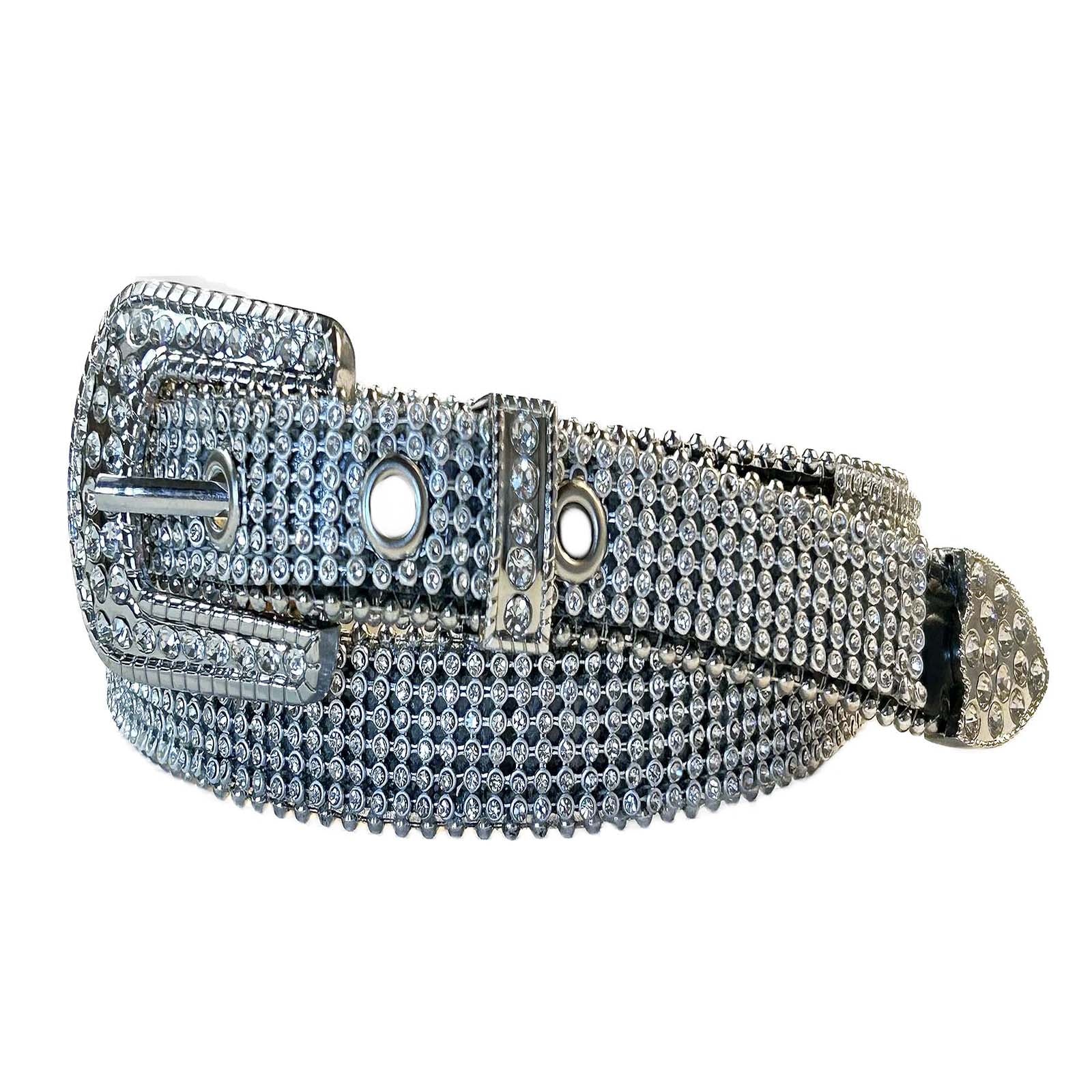 Fine tooled ostrich pattern saddle leather with full coverage pave rhinestones which looks like a million bucks! This belt has rhinestone studded 3 piece buckle set, and strap has fully beaded edge. Snaps make it easy to change buckle. Imported.