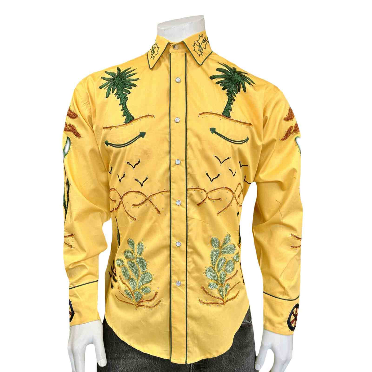 This design represents the art of the master shirt maker like few others. It has it all: palm trees, smile pockets with embroidered arrowhead ends, cacti, covered wagons, wagon wheels, piping, and shotgun cuffs.