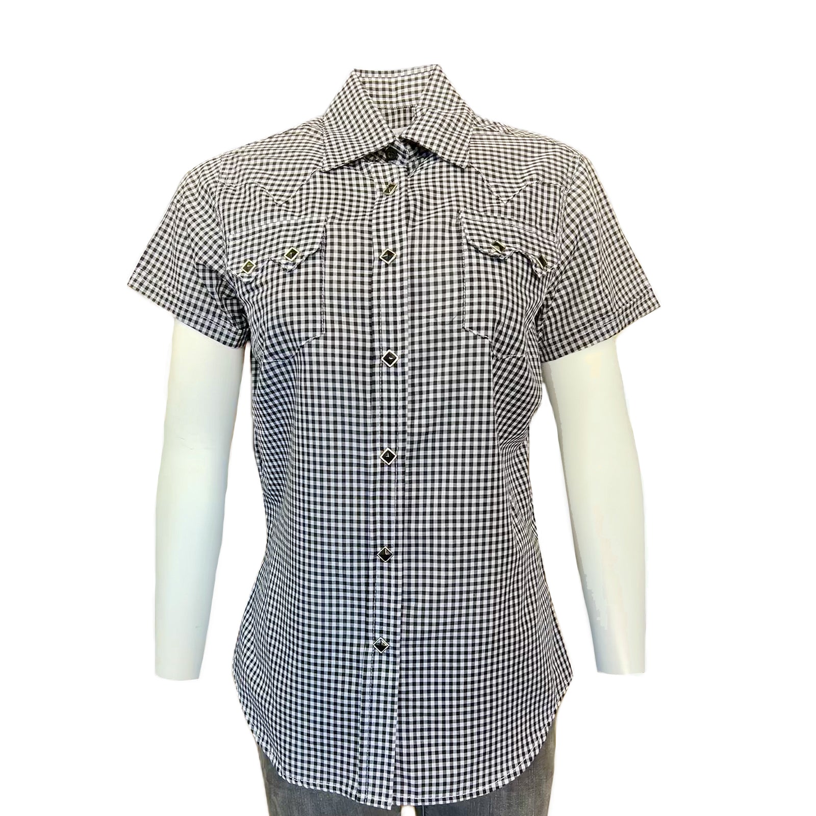 This women's short sleeve navy blue gingham check western shirt features Sawtooth pockets and Diamond snaps, our signature classic. The finest make in the business, this shirt features hard wearing top American edge-stitched construction with matching pocket patterns. Made in USA.