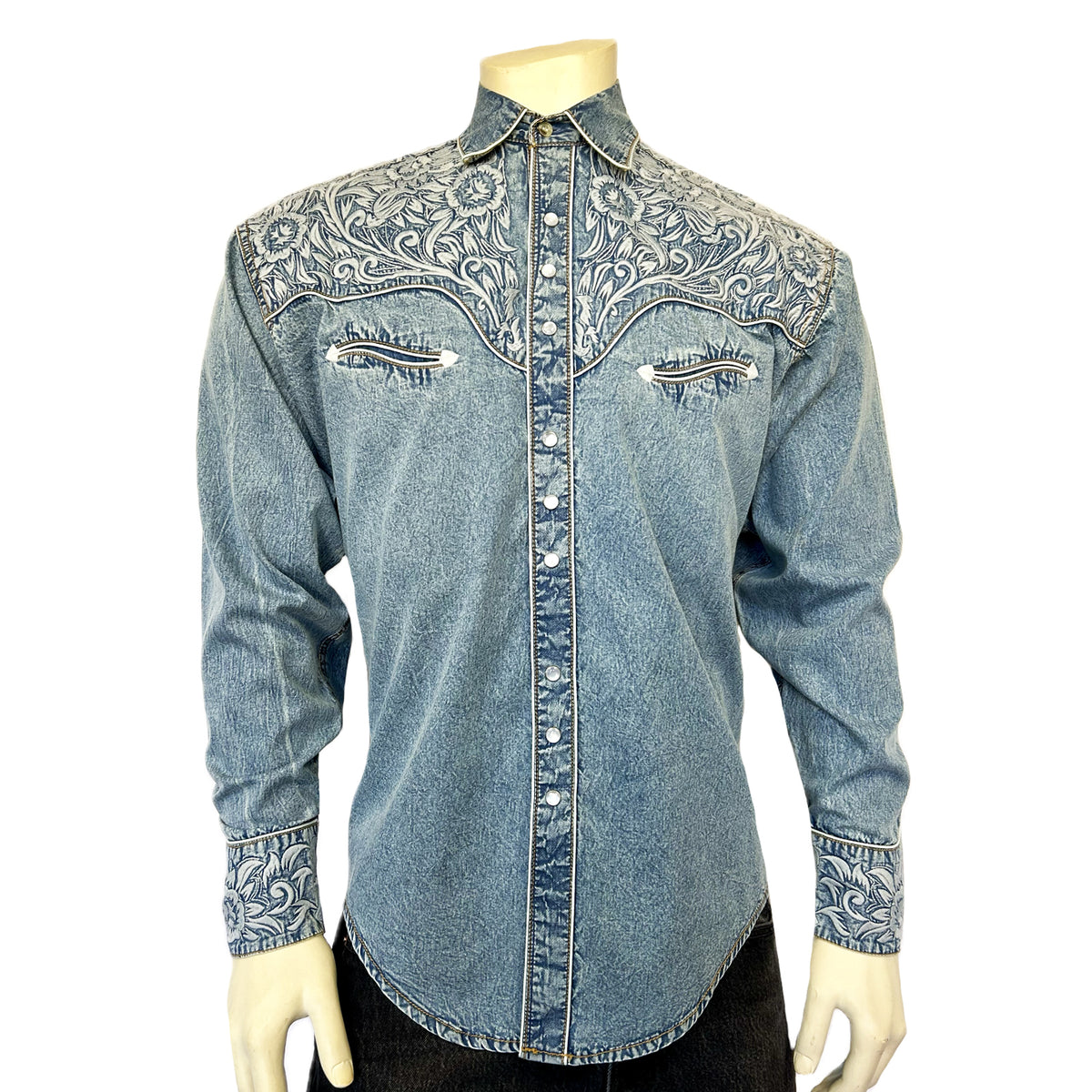 Fine western embroidery and Rockmount...pure Americana. This denim embroidery western shirt is a tribute to classic floral saddle tooling on front, back and cuffs. Stonewashed preshrunk 100% denim. This shirt has it all: top construction with piping, Smile pockets and shotgun cuffs. Imported.